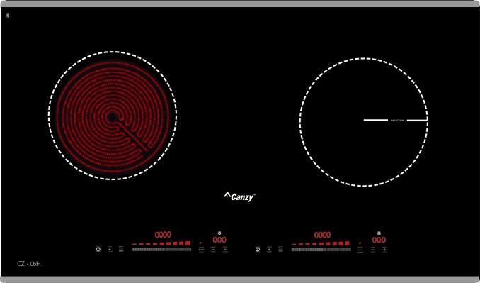 Sử dụng bếp điện từ Canzy CZ 06H nấu ăn rất nhanh chóng và tiện lợi với thiết kế hai vùng nấu: vùng nấu từ công suất booster lên 2100W kết hợp vùng nấu hồng ngoại sử dụng được các loại nồi công suất 2200W.