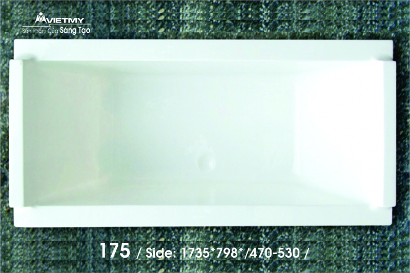 - Bồn tắm xây Việt Mỹ 175 với thiết kế nhỏ gọn, phù hợp cho 1 người tắm ngâm, với kích thước 1735 x 798 x 470 mm, độ sâu lòng bồn là 470 mm. Lượng nước có thể xả trong bồn lên tới 200 lít nước ~ 0,2m3 .