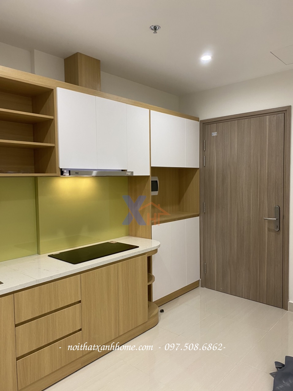 - Tủ bếp chữ i thẳng kết hợp tủ giày trang trí