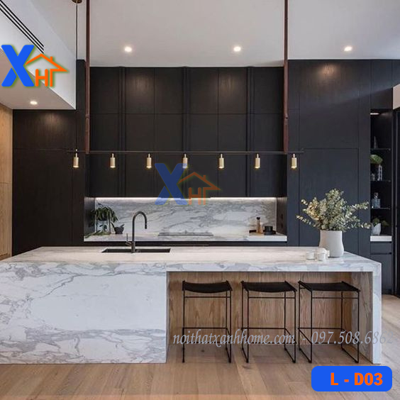Tủ bếp có bàn đảo ốp đá trắng có vân