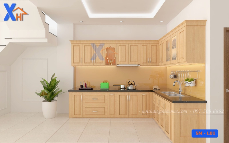 Thiết kế tủ bếp bằng gỗ Sồi Mỹ chữ L: